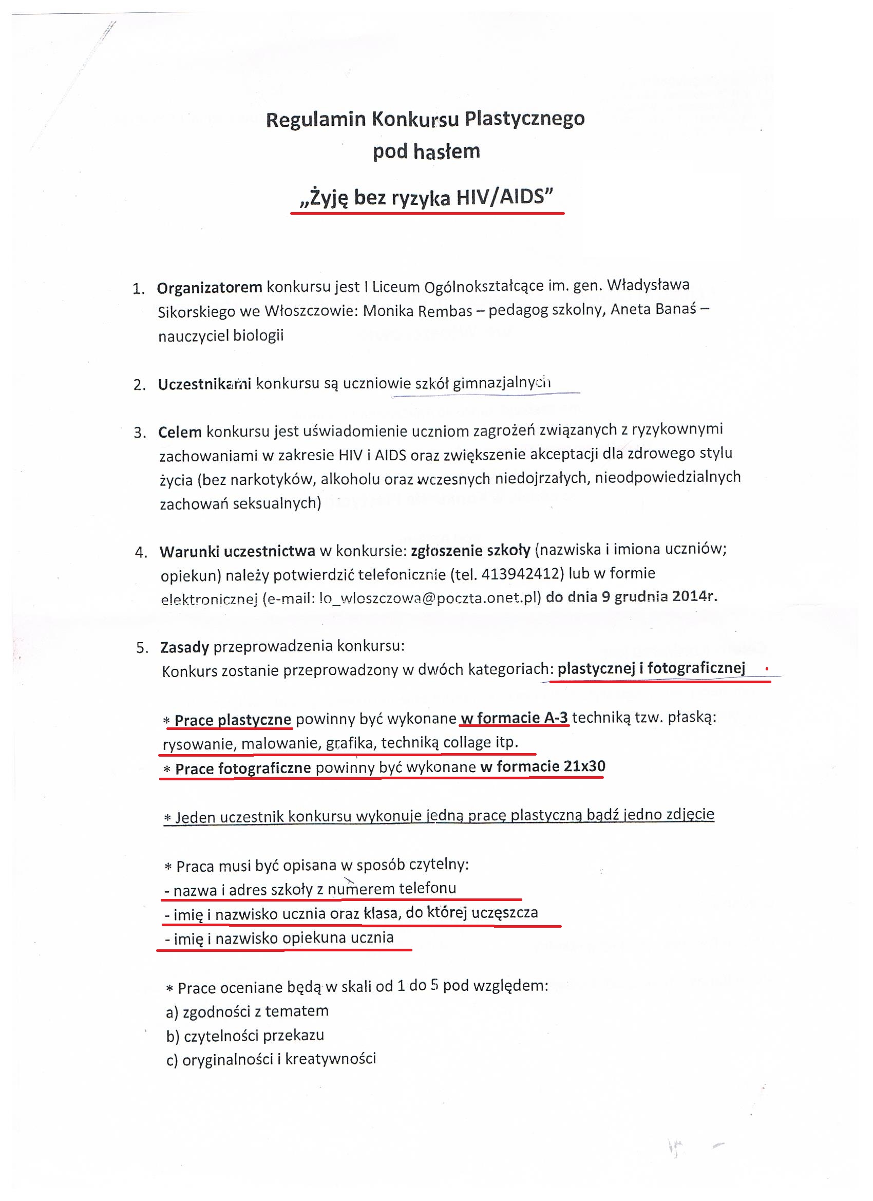 "Żyję bez ryzyka HIV/AIDS" - konkurs plastyczno-fotograficzny dla gimnazjalistów termin składania prac do 5 stycznia 2015r.Cele i wytyczne prac w załączniku. Załączniki kon1_001.jpg [389.81 kB] Powiązane wiadomości IV Małopolski Konkurs Piosenki Angielskiej Konkurs fotograficzny " Przyroda Powiatu Włoszczowskiego... " Włoszczowski Festiwal Żeromszczyzny" "Żyję bez ryzyka HIV/AIDS" - konkurs plastyczno-fotograficzny... SZKOLNA ZABAWA CHOINKOWA Konkurs plastyczny dla wszystkich uczniów szkoły... Drukuj Udostępnij Data dodania: 25.11.2014 Wyświetlono: 885 Ogłoszenia