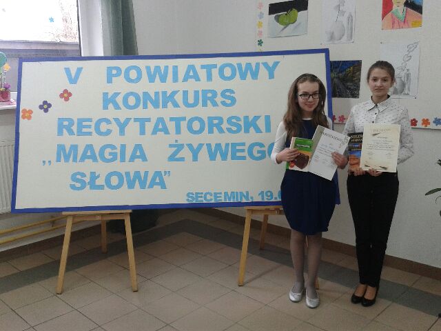 W dniu 19 marca 2015 roku w Zespole Szkół w Seceminie odbył się V Powiatowy Konkurs Recytatorski " Magia Żywego Słowa". Wzięły w nim udział uczennice reprezentujące nasze gimnazjum - Zuzanna Bełtowska i Julita Stefańska z klasy Ib. Obie odniosły sukces: Zuzanna Bełtowska - I miejsce w kategorii klas pierwszych gimnazjum, a Julita Stefańska otrzymała wyróżnienie. Gratulacje i życzenia dalszych osiągnięć w imieniu Grona Pedagogicznego i Dyrekcji złożyła nauczycielka języka polskiego Izabela Marcinkowska- Bujak.