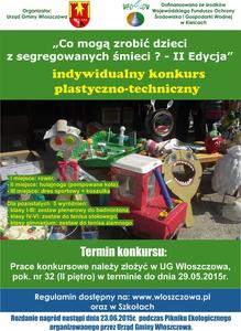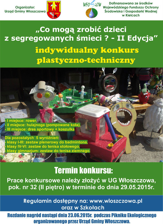 KONKURS PLASTYCZNO - TECHNICZNY „Co mogą zrobić dzieci z segregowanych śmieci – edycja II” Konkurs przeznaczony jest dla uczniów szkół podstawowych oraz gimnazjum.Termin składania prac 29.05.2015r. Regulamin w załączniku. Galeria zdjęć Załączniki regulamin konkursu [47.89 kB] Powiązane wiadomości II Ogólnopolski Konkurs Literacko – Plastyczny... Poławiacze skarbów "Współcześni bohaterowie ziemi włoszczowskiej"-... KONKURS PLASTYCZNO - TECHNICZNY „Co mogą zrobić... "Piękne krajobrazy ziemi włoszczowskiej"- konkurs... Konkurs dla gimnazjalistów na projekt graficzny... Drukuj Udostępnij Data dodania: 12.05.2015 Wyświetlono: 1029 Ogłoszenia
