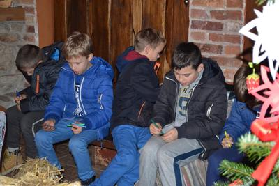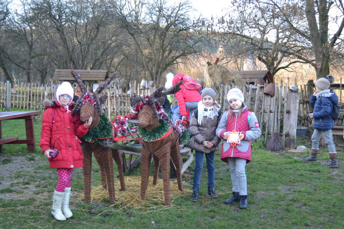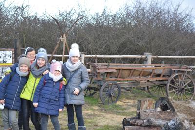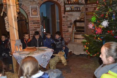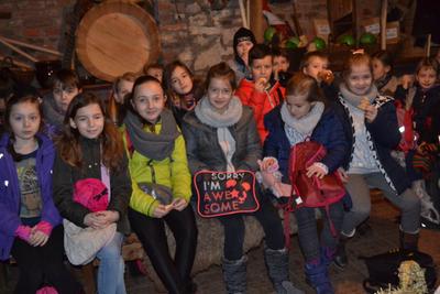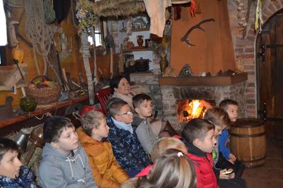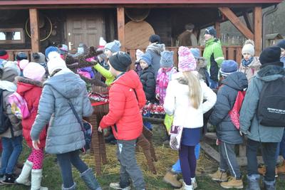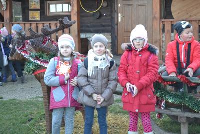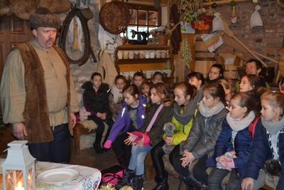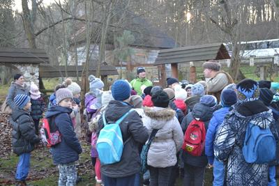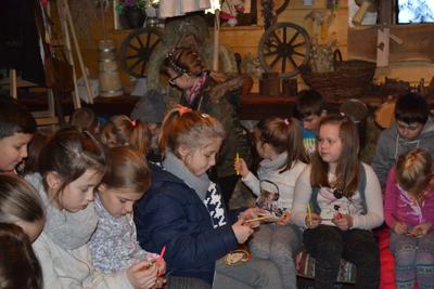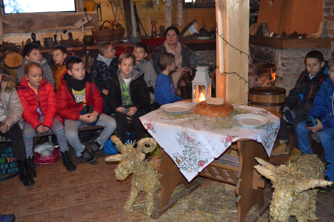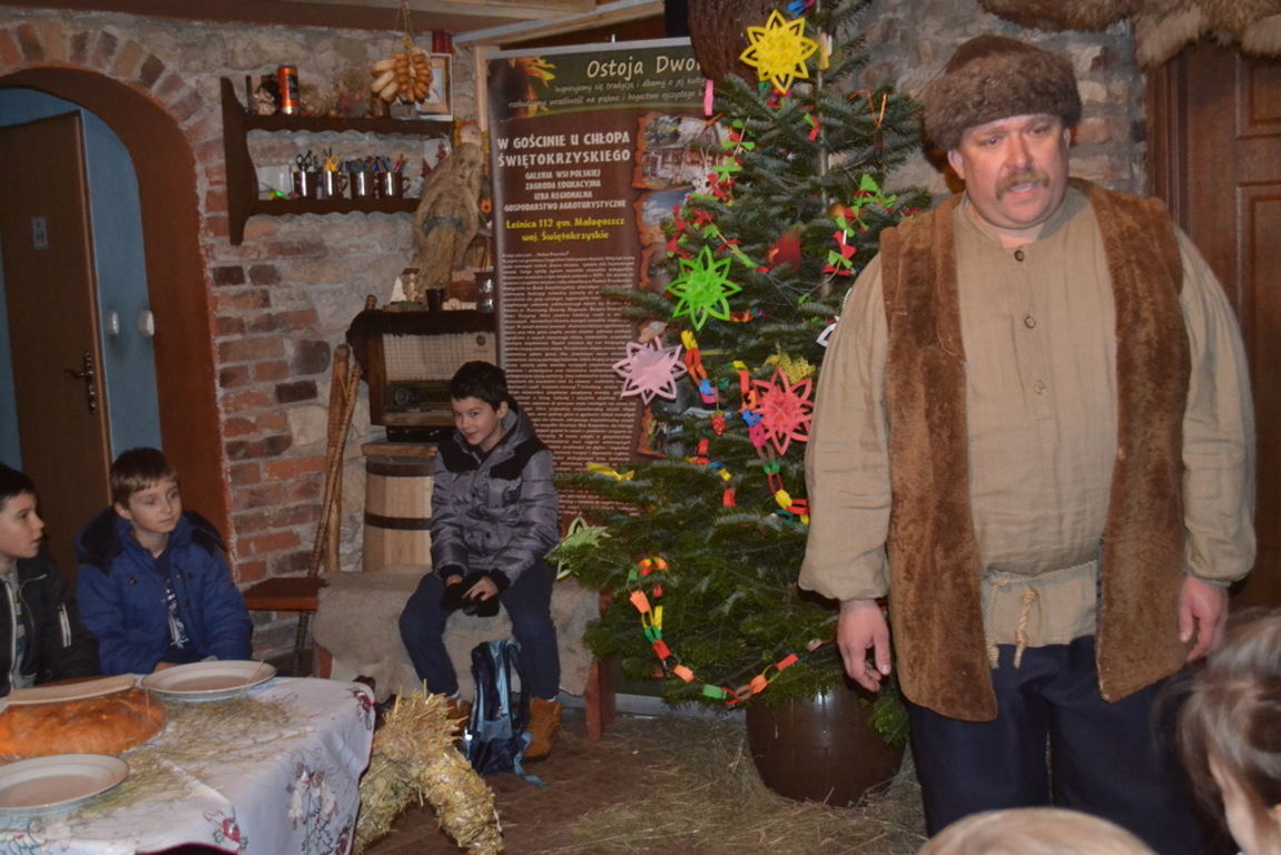 Uczestników wycieczki powitał gwarą gospodarz – chłop świętokrzyski Pietrek. Pierwszym punktem programu było zwiedzanie Galerii Wsi Polskiej, w tym stajenki betlejemskiej, wykonanej z naturalnych darów pola, lasów i łąki. Następnie w świątecznie udekorowanej zagrodzie edukacyjnej odbyły się zajęcia – pogadanka na temat „ Tradycje świąteczne naszego regionu”, wspólne śpiewanie kolęd oraz improwizacje ruchowe „Z życia dawnej wsi”. Dużą przyjemność sprawiło uczniom samodzielne wykonanie ozdoby choinkowej z drewna oraz degustacja pysznych, świątecznych ciasteczek.