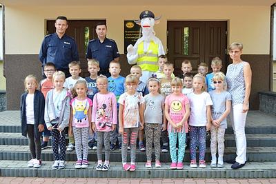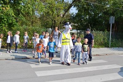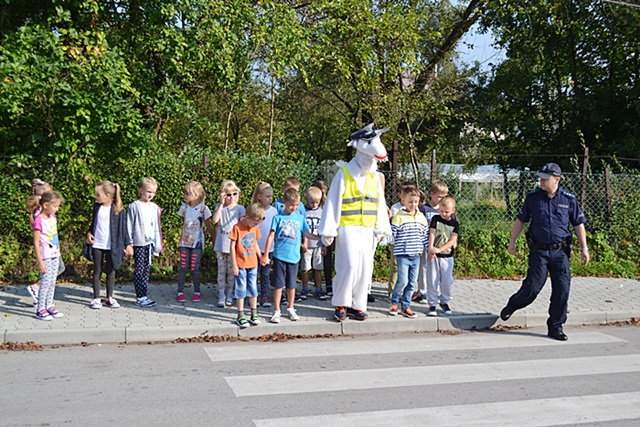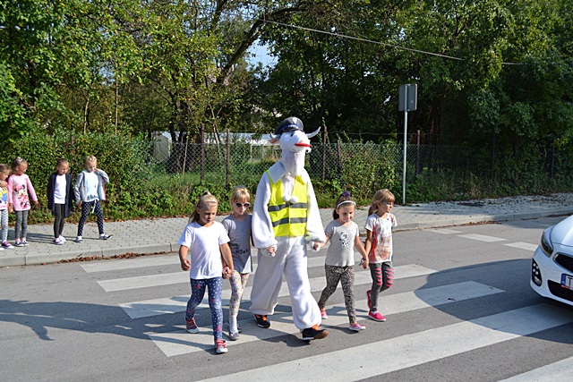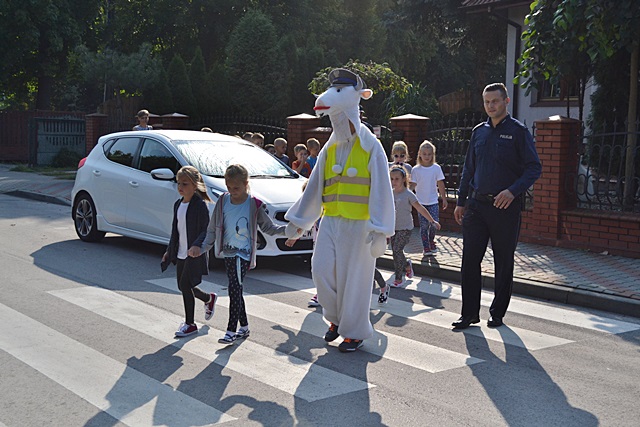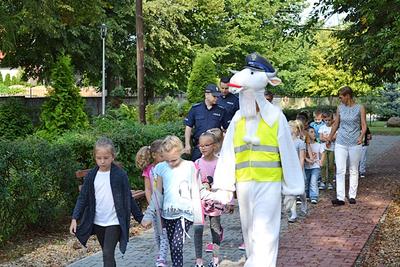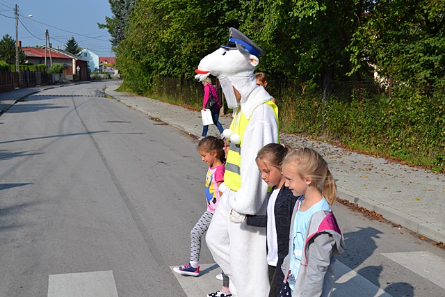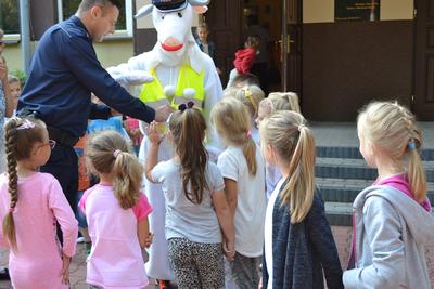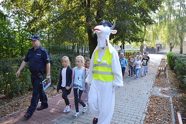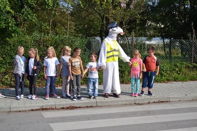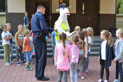 Jak co roku we wrześniu w ramach akcji „Bezpieczna droga do szkoły” miało miejsce spotkanie uczniów klasy I z policjantami. Dzielnicowi asp. Adam Ciesielski i mł. asp. Rafał Sędek przeprowadzili teoretyczną i praktyczną lekcję bezpiecznego poruszania się po drodze. Omówili rolę odblasków, pokazali znaki drogowe w pobliżu szkoły i nauczyli dzieci prawidłowo przechodzić przez pasy. Bardzo pomocny okazał się koziołek Spoko, który towarzyszył uczniom w nabywaniu nowych umiejętności.