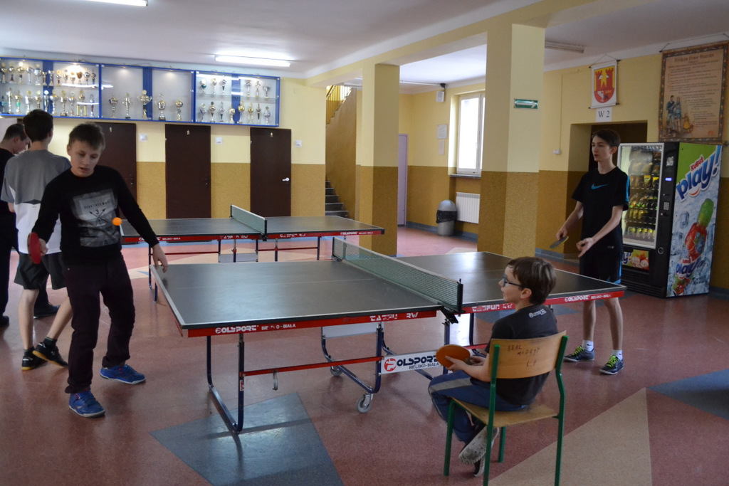 i obszerny hol, na którym zostały rozstawione stoły do gry w tenisa.