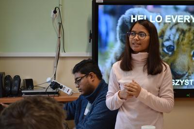 Ciekawym elementem spotkania była możliwość poznania kilku podstawowych słów w języku rodzimym naszych gości . Nasi uczniowie mogli też napisać swoje imię w trzech jezykach : chińskim ,tajskim i syngaleskim - co było nie lada wyzwaniem .