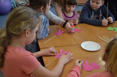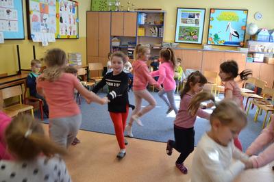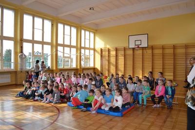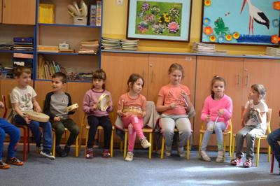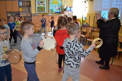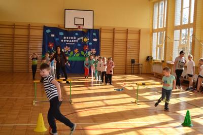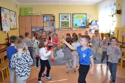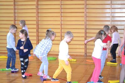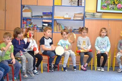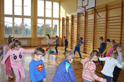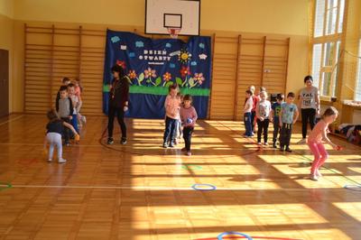 W sali gimnastycznej na dzieci czekały konkurencje sportowe podczas których dzieci mogły sprawdzić swoją sprawność ruchową. Jedną z atrakcji były zajęcia muzyczne z wykorzystaniem instrumentów perkusyjnych.