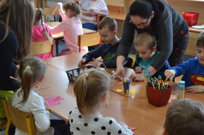 Licznie przybyłych przedszkolaków przywitała na sali gimnastycznej P. dyrektor E.J. Molenda. W kilku zdaniach zapoznała zebranych z atrakcjami jakie czekały na dzieci. Następnie przedszkolaki rozeszły się do sal, gdzie uczestniczyły w różnych ciekawych zajęciach. Rozwijały swoje zdolności manualne wykonując piekne swiąteczne ozdoby z papieru. Wykonywały zadania rozwijające logiczne myslenie na tablicy interaktywnej.
