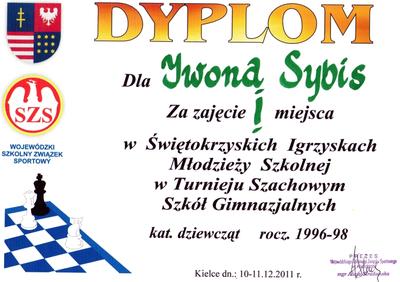 Iwona Sybis uczennica klasy 2b Publicznego Gimnazjum nr 2 we Włoszczowie, zwyciężyła w swojej kategorii w Świętokrzyskich Igrzyskach Młodzieży Szkolnej w Turnieju Szachowym Szkół Gimnazjalnych i po raz piąty zostala mistrzynią wojewodztwa. Zdobyła komplet pnktów pokonując liczną ekipę dziewcząt z gimnazjum w Cieszkowicach, które zajęły sześć kolejnych miejsc oraz szachistki ze Skarzyska-Kamiennej. Przygoda z szachami Iwony Sybis trwa piec lat. W tym czasie kilkakrotnie reprezentowała województwo na indywidualnych i drużynowych Mistrzostwach Polski w Szachach.