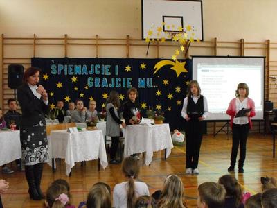 22.12.2011r. spotkaliśmy się ostatni raz w starym roku w świątecznym nastroju na konkursie "Jaka to kolęda?" przygotowanym przez p.Bożenę Bomba i p.Andrzeja Stawczyka. Konkurs miał formułę podobną do znanego programu telewizyjnego: "Jaka to melodia?". Podczas oddzielnych edycji dla szkoły podstawowej oraz dla gimnazjalistów po jednej lub kilku nutach reprezentanci klas musieli podać tytuł kolędy. Każda z wybranych do konkursu kolęd była prezentowana w całości lub fragmencie przez wokalistów z gimnazjum przygotowanych przez p. Andrzeja Stawczyka i p. Małgorzatę Szwarc.