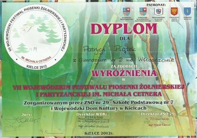 13 kwietnia Patrycja Piątek, uczennica klasy 2c, reprezentowała Publiczne Gimnazjum nr 2 we Włoszczowie na koncercie finalowym VII Wojewódzkiego Festiwalu Piosenki Żołnierskiej i Partyzanckiej w Kielcach, który z roku na rok podnosi poprzeczkę wokalistom z województwa świętokrzyskiego. Patrycja zaśpiewała piosenkę "Tango na głos, orkiestrę i jeszcze jeden głos" i zdobyła wyróżnienie w kategorii solistów z gimnazjum.