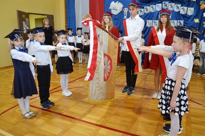Uroczystość Ślubowania uczniów klas pierwszych to bardzo ważny moment w życiu zarówno dzieci jak i całej szkoły. 20 października 2022 roku w Szkole Podstawowej nr 2 we Włoszczowie dzień ten obchodzony był bardzo uroczyście. W przepięknie udekorowanej sali gimnastycznej zebrali się zaproszeni goście oraz uczniowie klas I a, b. W przygotowanej przez nich części oficjalnej znalazły się wiersze i piosenki mówiące o zachowaniu na terenie szkoły i klasy, bezpieczeństwie w ruchu drogowym oraz wychowaniu patriotycznym. Nad prawidłowym wykonaniem czuwały wychowawczynie mgr Matylda Jałocha, mgr Małgorzata Hamera. Dzieciaki „egzamin” zdały „śpiewająco”, dlatego też do nich skierowanych było wiele gratulacji, ciepłych życzeń. Pierwszaki zostały obdarowane pamiątkowymi dyplomami, prezentami od wzruszonych rodziców, upominkami od starszych kolegów z klas II i III oraz gości. Zachwyceni pierwszoklasiści zaproszeni zostali również na słodki poczęstunek. Mimo olbrzymiej tremy, jaka towarzyszyła małym artystom, ich buzie do końca imprezy były promiennie uśmiechnięte. Mamy nadzieję, że bardzo długo będą pamiętały o tym wydarzeniu i chętnie powracały do niego we wspomnieniach.