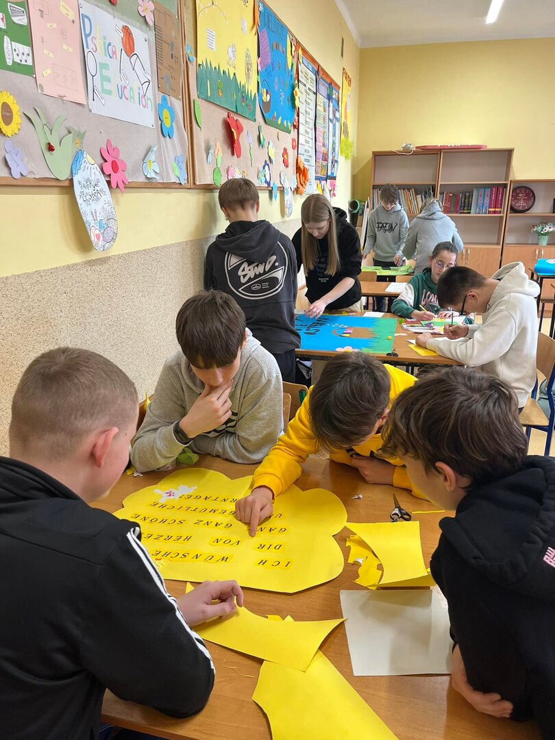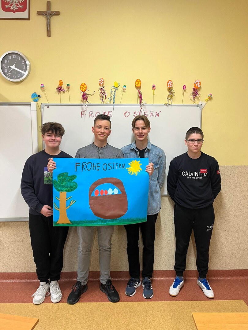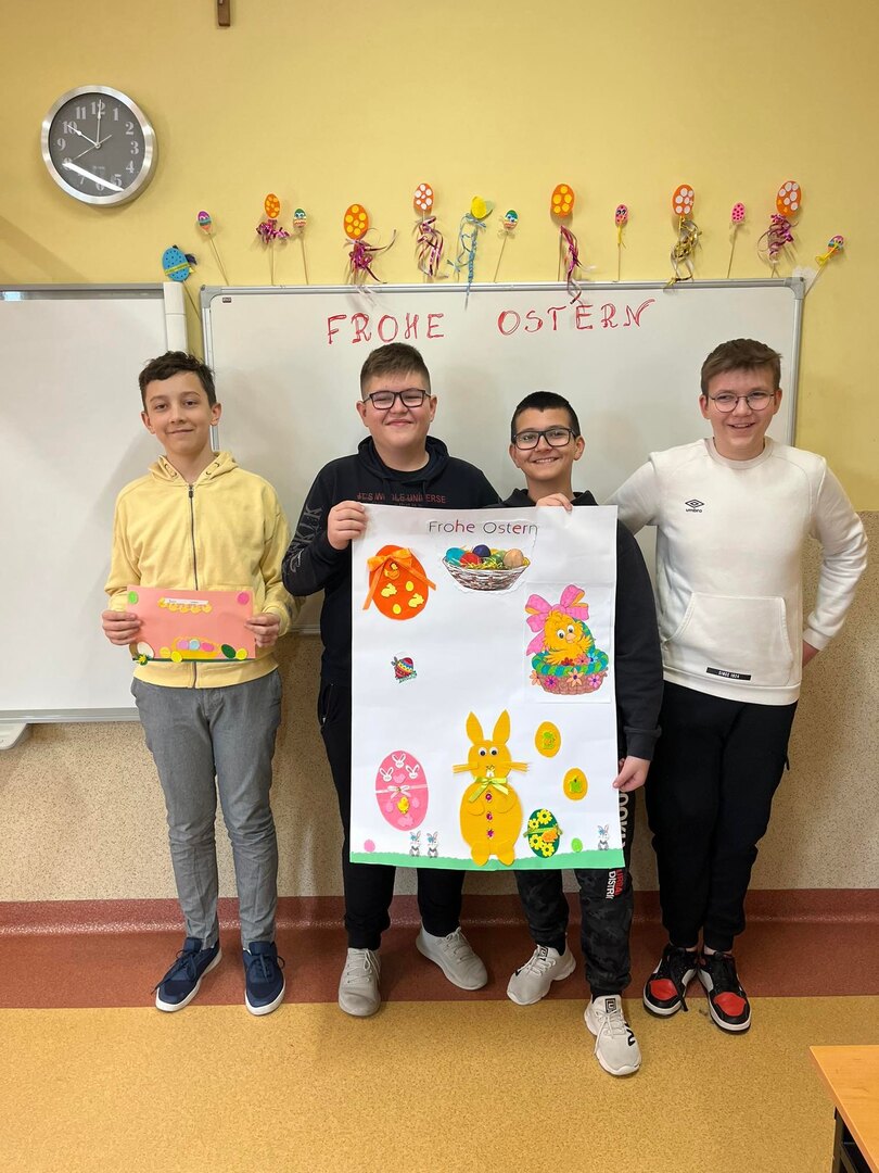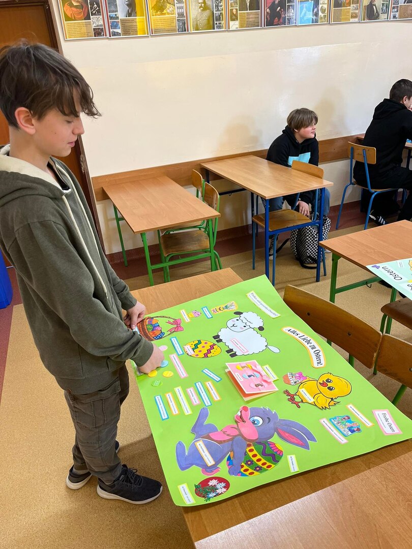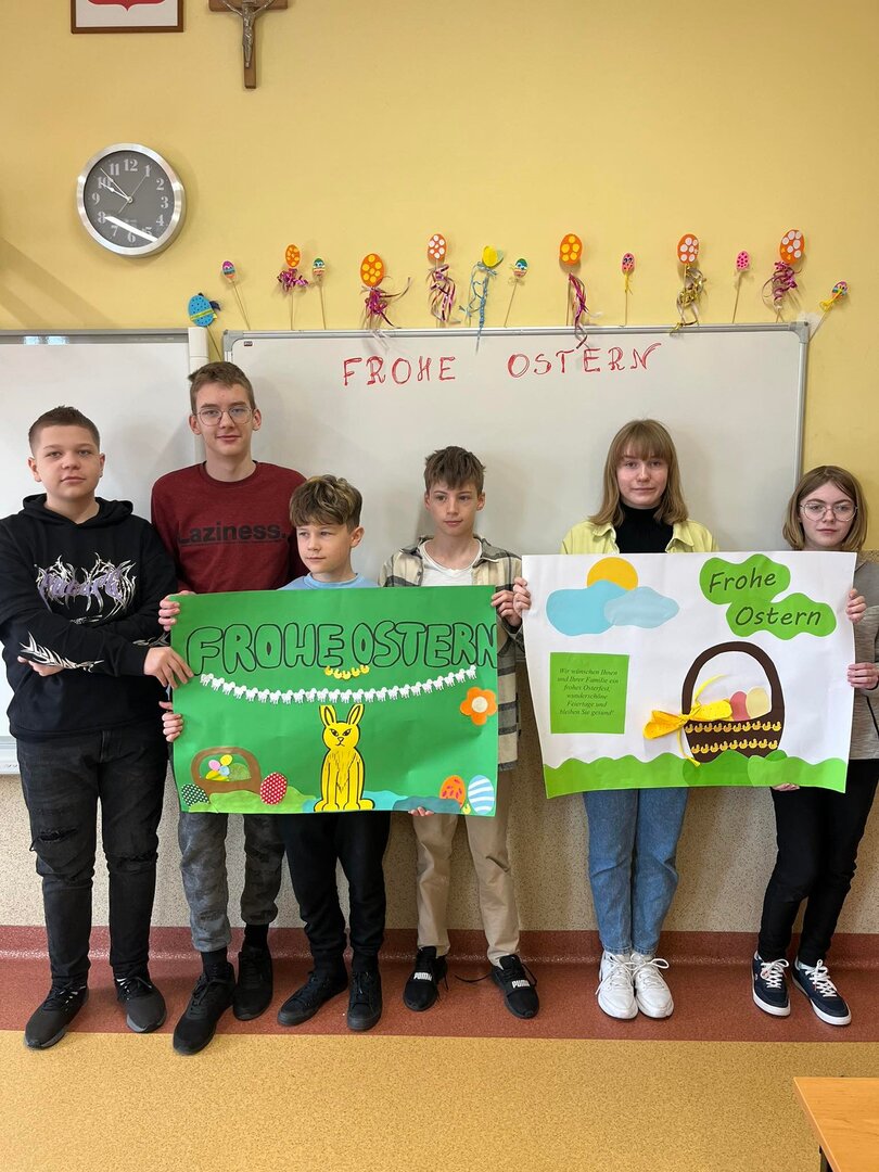 W ramach wielkanocnych lekcji projektowych z języka niemieckiego uczniowie klas siódmych i ósmych wykonywali w zespołach Osterposter (plakaty wielkanocne).