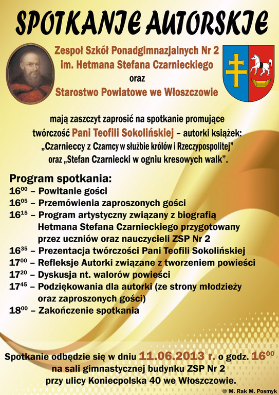 Społeczność Zespołu Szkół Ponadgimnazjalnych Nr 2 im. Hetmana Stefana Czarnieckiego oraz Starostwo Powiatowe we Włoszczowie mają zaszczyt zaprosić na spotkanie promujące twórczość Pani Teofili Sokolińskiej – autorki książek: „Czarnieccy z Czarncy w służbie królów i Rzeczypospolitej” oraz „ Stefan Czarniecki w ogniu kresowych walk”.