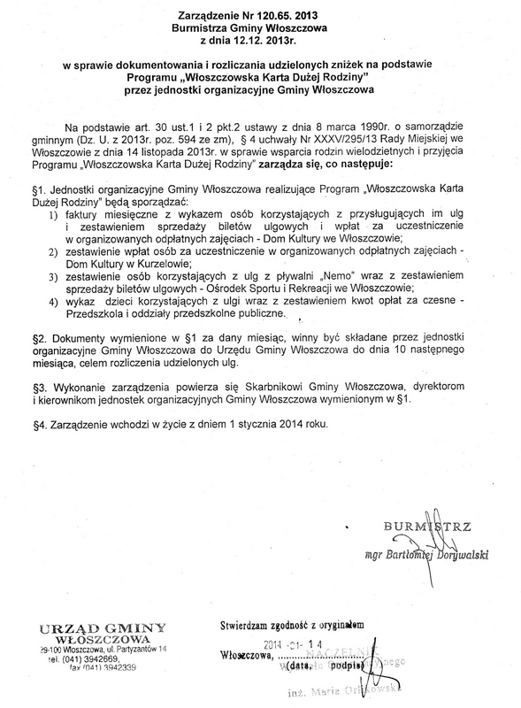 Dyrektor ZPO nr 2 informuje, że zgodnie z § 8 ust. 1 uchwały Nr XXXV/295/13 Rady Miejskiej we Włoszczowie z dnia 14 listopada 2013r. w sprawie wsparcia rodzin wielodzietnych i przyjęcia programu „ Włoszczowska Karta Dużej Rodziny” dokumentem potwierdzającym uprawnienia do korzystania z przywilejów określonych w Programie Włoszczowska Karta Dużej Rodziny jest karta przyporządkowana indywidualnie do każdego uprawnionego członka rodziny i korzystanie ze zniżek na podstawie wydanej przez Urząd Gminy karty możliwe jest wyłącznie z dokumentem tożsamości – karta jest ważna wraz z kartą rodzica, opiekuna prawnego lub rodzeństwa posiadającego dokument potwierdzający tożsamość.