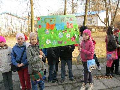 Uczniowie klas 1-3 oraz dzieci z oddziału przedszkolnego i zerówki w dniu 21.03.2014r. pożegnały zimę i powitały wiosnę.O godzinie 8.30 obok budynku szkoły odbyła się zbiórka.Dzieci z klasy 2b i3a przyniosły ze sobą wykonane samodzielnie plakaty,natomiast uczniowie klasy 2a recytowali wiersze o wiośnie .W dalszej części spotkania dzieci śpiewały klasami piosenki tematycznie związane z wiosną ,następnie spalono Marzannę symbol odchodzącej zimy.Przemarsz ulicami miasta oraz pobliskimi łąkami celem odszukania pierwszych zwiastunów wiosny zakończył obchody pierwszego dnia wiosny.Po powrocie do szkoły wszystkie dzieci otrzymały słodki upominek.