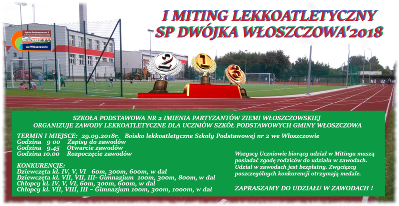 14.09.2018 Aktualności Zapraszamy do udziału w I Mitingu Lekkoatletycznym I Miting Lekkoatletyczny SP Dwójka Włoszczowa – 2018r. ... Czytaj więcej