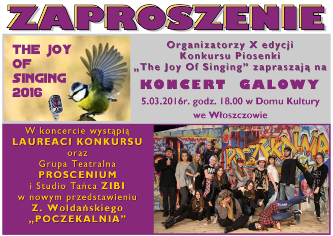 01.03.2016 Aktualności Zpraszamy na finał The Joy Of Singing' Włoszczowa 2016 W sobotę 5 marca odbędzie sie X już edycja Konkursu Piosenki Anglojęzycznej The Joy Of Singing. Do konkursu zgłosiło się ok 120 uczniów szkół podstawowych, gimnazjów i szkoł ponadgimnazjalnych,... Czytaj więcej